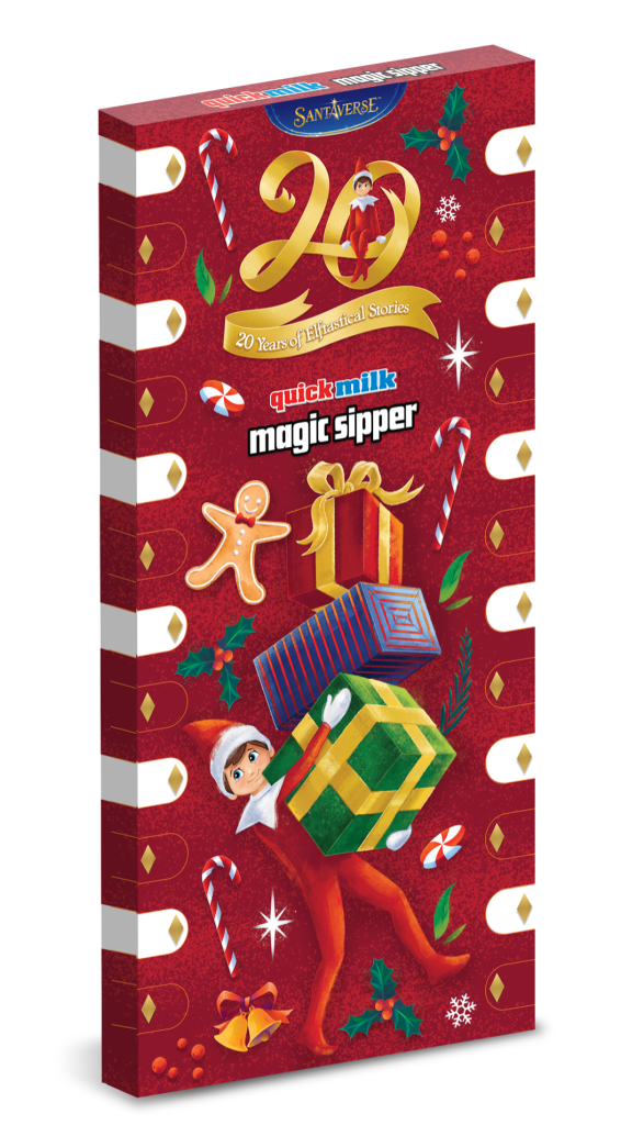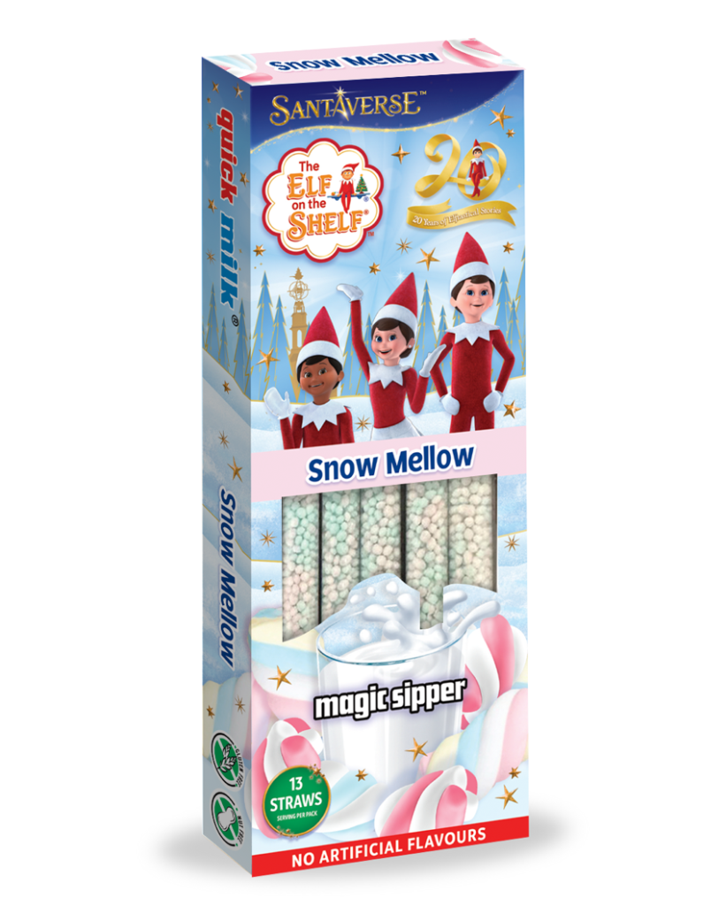 The Elf on the Shelf Range comprises four festive flavour Magic Sippers, in exquisite branded packaging that not only leaps off the shelf, but also delivers an equally exciting journey for the taste buds. Available in 13 packs, the Elf on the shelf Magic Sipper flavours are; White Chocolate, Frosted Strawberry, Candy Cane and Snow Mellow (below).