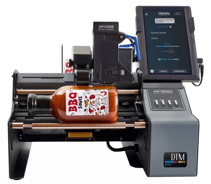 Manufactured by Primera Technology Inc., the compact date coder can be easily installed into the AP360e and AP362e Label Applicators to create one integrated machine that prints lot codes, dates and more directly onto round containers while labels are applied. It doesn’t need a separate power supply and includes a full-colour touchscreen to enter data and configure date and lot codes. The print fields are free-format and can include letters, numbers and symbols. Formats can be stored for later use to speed up production.