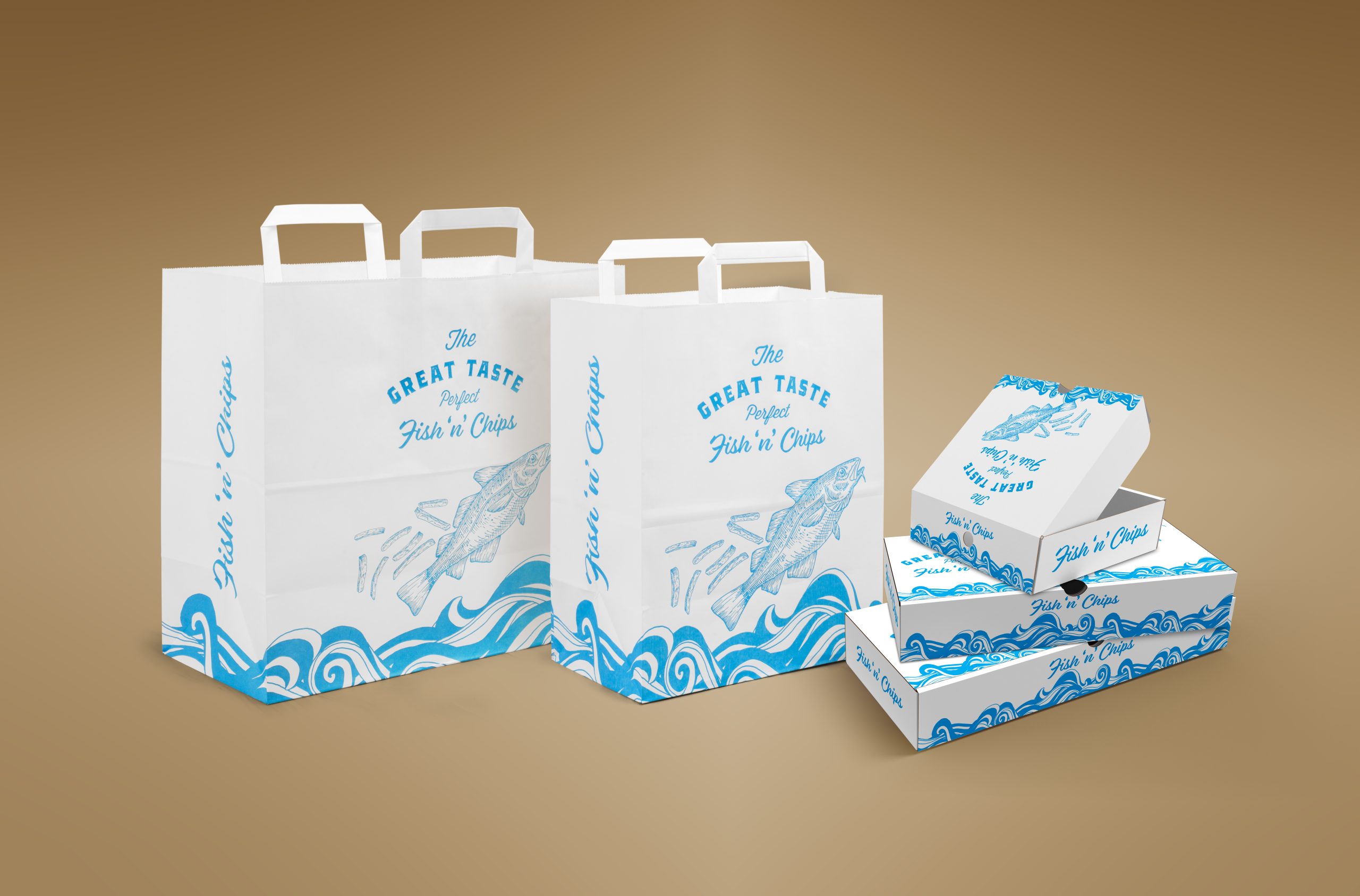 The new ‘Great Taste’ fish ‘n’ chips packaging range includes a series of small, medium, and large, eye-catching paper boxes and small and large paper bags, with handles. The bags carry the same design as the boxes and are intended to complement those boxes, with the complete range offering an opportunity for sellers to provide a more considered, identifiable offering that appears unique to the individual food retail outlet.