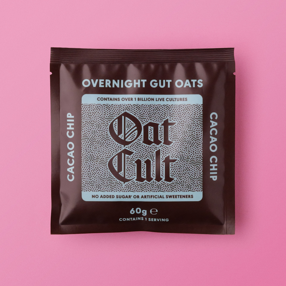 Blending medieval cult aesthetics with gut health science, Oat Cult’s striking typography and gut-bacteria-inspired patterns make it instantly recognisable. Its compact square packs are built for modern life – easy to store, grab, and go.